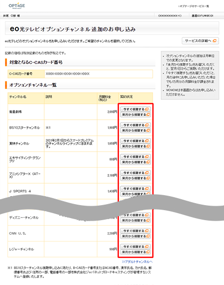 〔eo光テレビオプションチャンネル追加のお申し込み〕画面が表示されます。追加を希望するチャンネル名の契約状況から〔今すぐ視聴する〕または〔来月から視聴する〕を押します。