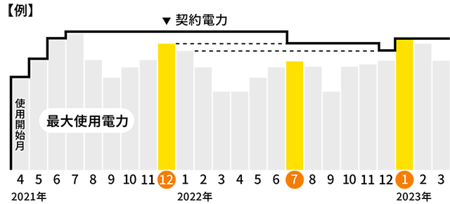 契約電力は、当月を含む過去1年間の各月の最大使用電力のうち最も大きい値をいいます。