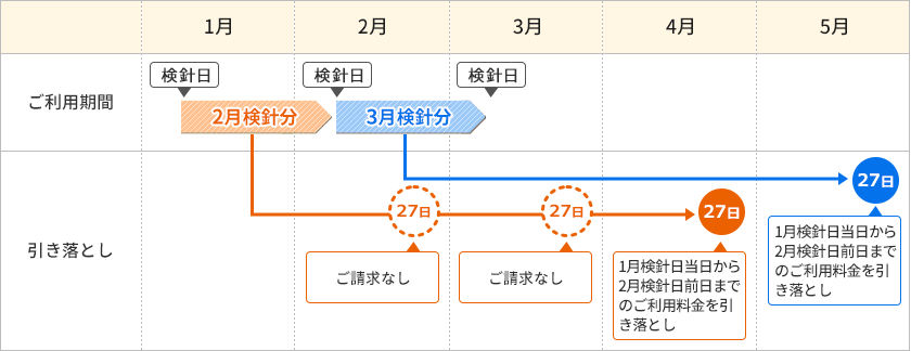 毎月27日(土日祝の場合は翌営業日)に前月ご利用分を口座から引き落とします。