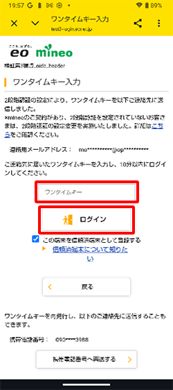 ご登録の携帯電話番号または連絡用メールアドレスに届いたワンタイムキーを入力し、〔ログイン〕を押してください。