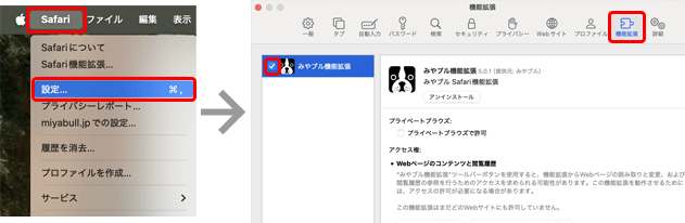 Safariを起動した状態で、メニューバーの〔Safari〕→〔設定〕を押すと環境設定画面が表示されるので、〔機能拡張〕タブを押し、〔みやブル機能拡張〕の項目にチェックを入れてください。