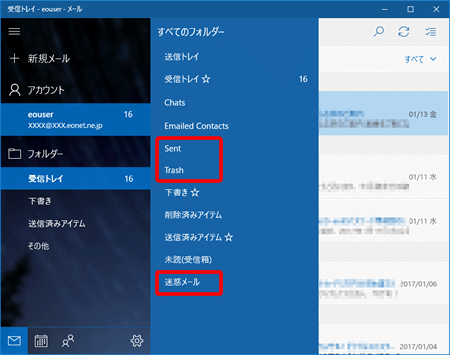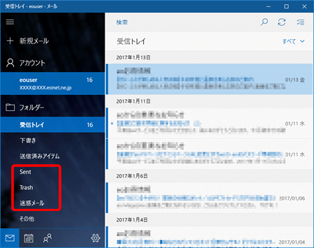左のフォルダー一覧に、追加したいフォルダーが追加されます。(ここでの事例では〔Sent〕〔Trash〕〔迷惑メール〕)