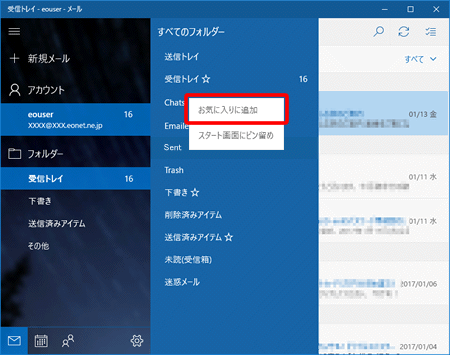 〔すべてのフォルダー〕内の追加したいフォルダー(以下の例は〔Sent〕〔Trash〕〔迷惑メール〕)を右クリック(またはタップ)します。