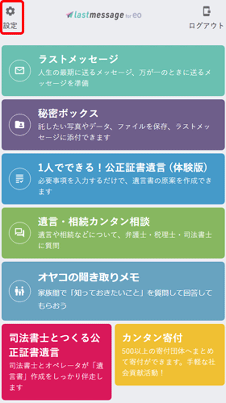 lastmessage for eoマイページへログインし、画面左上の〔設定〕を押します。