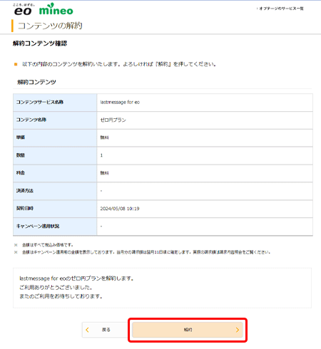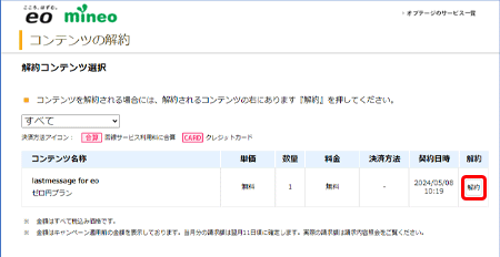 〔解約コンテンツ選択〕画面で、〔lastmessage for eo ゼロ円プラン〕欄の〔解約〕を押します。