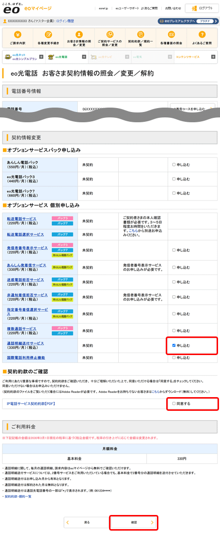 〔IP電話サービス契約約款【PDF】〕欄の〔同意する〕にチェックを入れて、〔確認〕を押します。