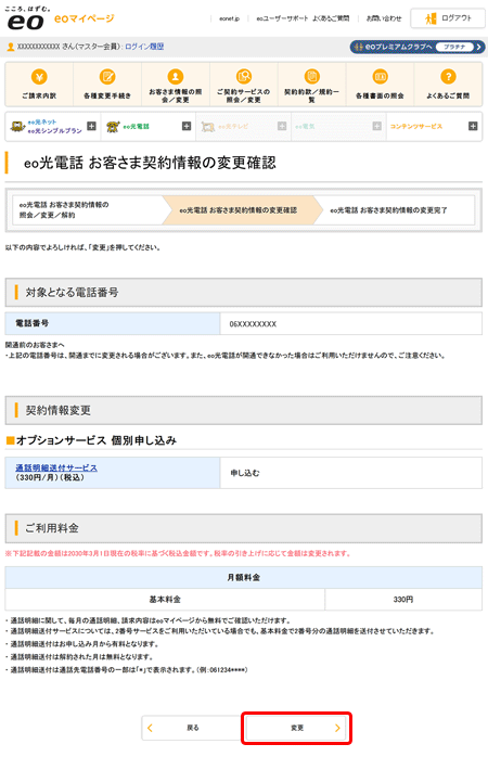 〔eo光電話 お客さま契約情報の変更確認〕画面で、お申し込み内容を確認し、問題がなければ〔変更〕を押します。