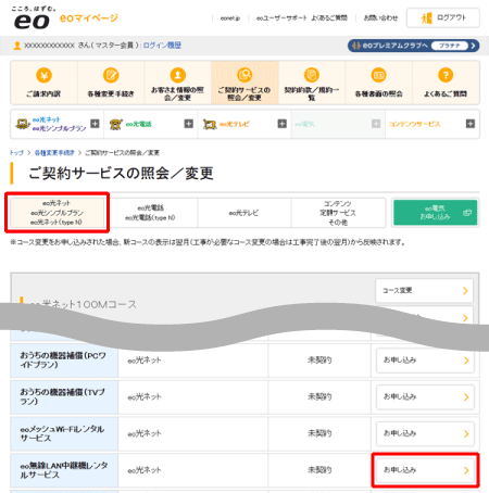 初期登録完了後に表示されるeoマイページで同じ項目を押すと、以降は同様の画面が表示されます。