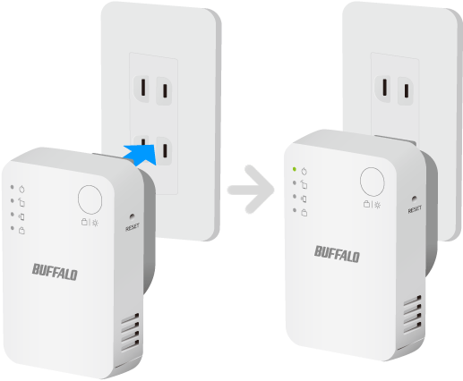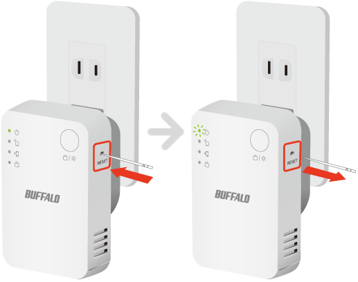 〔RESET〕スイッチを細い棒状のもの(つまようじなど、電気を通さない材質のもの)で5秒程度押し続け、〔POWER〕ランプが緑点滅したら離します。