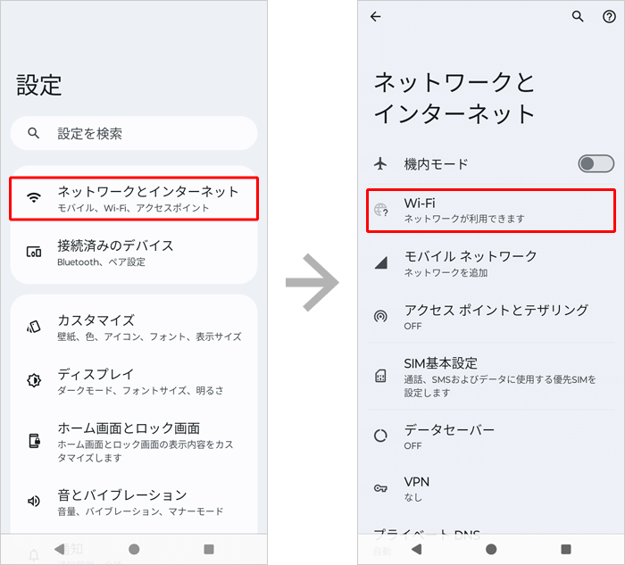 設定したいスマートフォンの〔設定〕→〔ネットワークとインターネット〕→〔Wi-Fi〕をタップします。