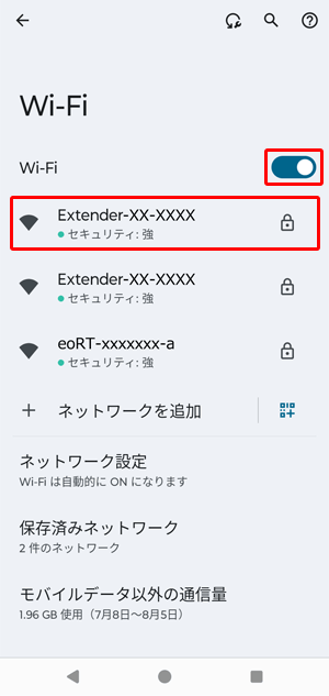 〔Wi-Fi〕を〔オン〕にし、「STEP1」で確認した〔中継用SSID〕を押します。