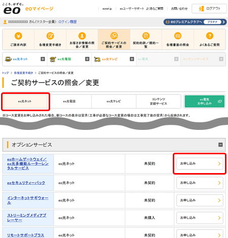 初期登録完了後に表示されるeoマイページで同じ項目を押すと、以降は同様の画面が表示されます。