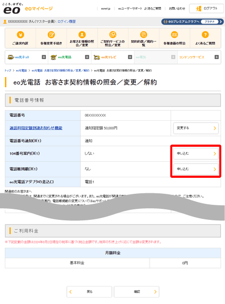 初期登録完了後に表示されるeoマイページで同じ項目を押すと、以降は同様の画面が表示されます。