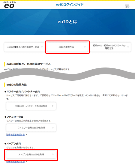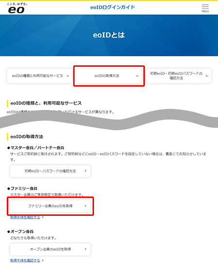 〔eoIDとは〕画面で、〔eoIDの取得方法〕→〔ファミリー会員のeoIDを取得〕を押します。