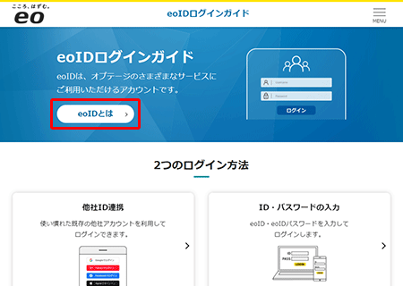 「eoIDログインガイド」画面で、〔eoIDとは〕を押します。
