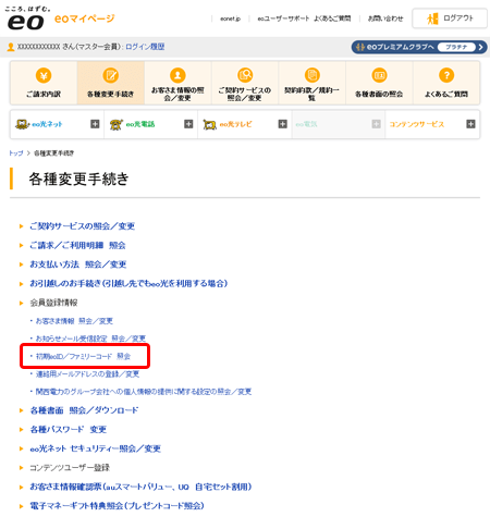 〔各種変更手続き〕画面で、〔初期eoID/ファミリーコード照会〕を押します。