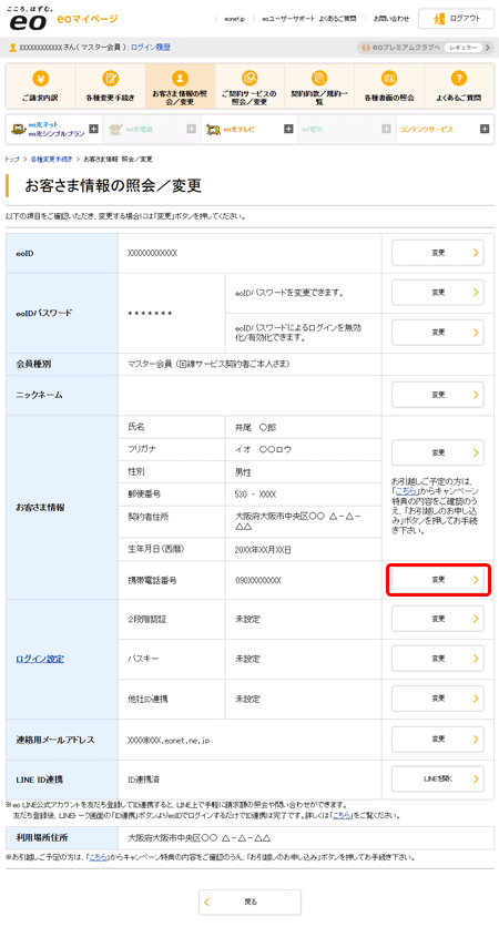 登録されている携帯電話番号は、eoマイページから変更できます。