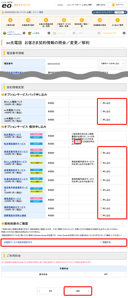 - 1番号ごとにご利用料金がかかります。ただし、「通話明細送付サービス」のみ1送付ごとなので、2番号とも申し込まれた場合も300円/月です。(マスター会員のみご利用いただけます)