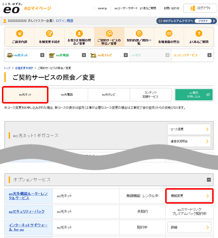 〔eo光ネット〕から、〔eo光多機能ルーターレンタルサービス〕欄の〔機能変更〕を押します。