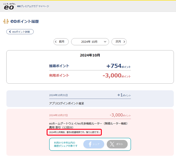 例)「2023年09月現在、割引11回適用済です。残り1回です。」の場合 2023年9月ご利用分まで特典が適用されます。 特典の継続利用については「保有eoポイントを利用した特典を引き続き利用したい」をご確認ください。