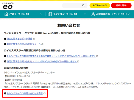 「ウイルスバスター クラウド 月額版 for eo お問い合わせ」から、〔トレンドマイクロお問い合わせ先表示〕を押します。